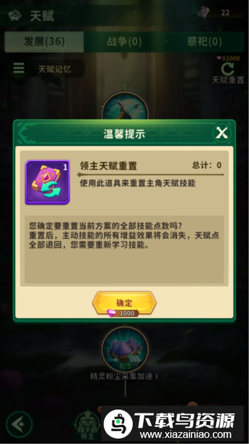 如果不小心点错天赋,也不必担心。点击天赋页面右上角的【天赋重置】按钮,花费1000钻石即可重置全部天赋点。