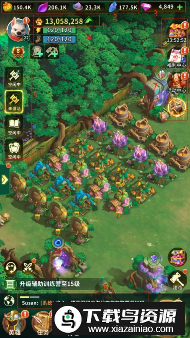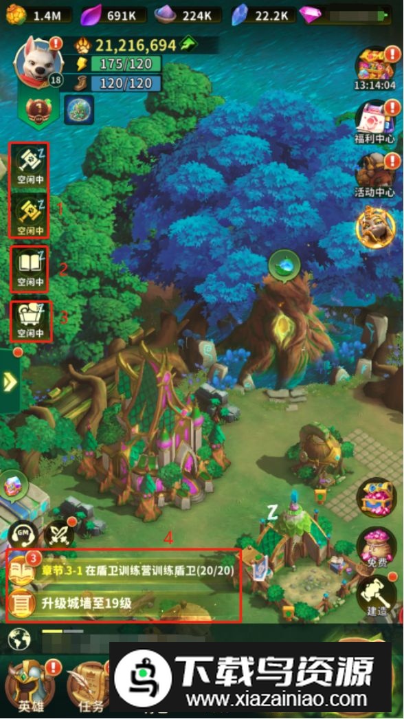 1. 点击该按钮查看内城建筑建造进度,额外队列可通过主线任务限时获取或永久购买解锁;