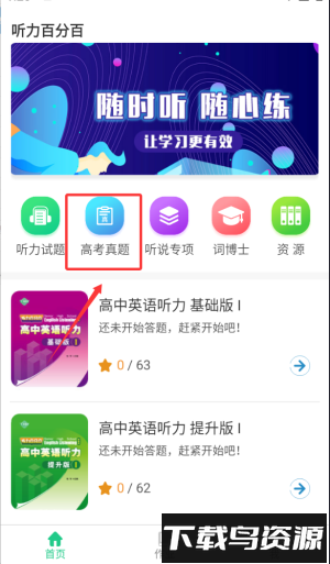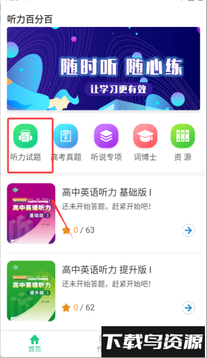 3、资源中心包含教材同步音频、高考真题与模拟试题三大类,支持单句循环、变速播放、AB复读等多种学习模式;