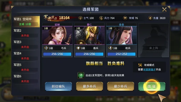 4、准备攻城作战,选择需要上阵的将领;