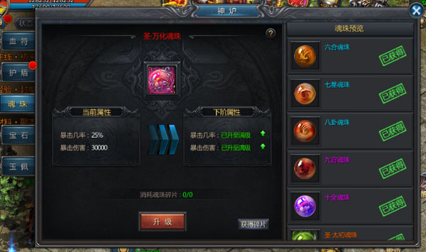 魂珠界面划分15级品质,等级越高暴击增益越明显。低阶魂珠消耗碎片升级进化。碎片来源于打怪产出、活动奖励、商城直购等渠道;魂珠培养实现高额暴击输出;