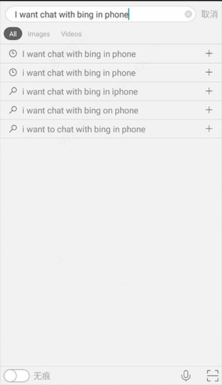 2、在搜索框中输入“I want chat with bing in phone”,注意在手机端输入其他文字通常仅执行普通搜索,不会触发AI对话;