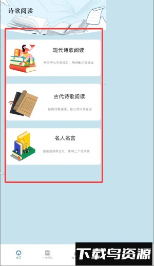 3、服务范围覆盖小说、诗歌、答题、笔记、打卡和社区六大板块,分类清晰,便于用户查找所需内容;