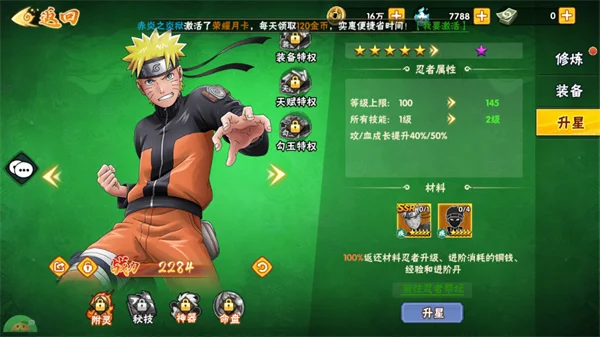 3、忍者星级:提升忍者星级是大幅增强其属性与战力的核心途径。