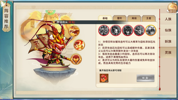 主动技能:百无禁忌,对敌方全体造成基础伤害与额外伤害,并概率石化敌人;