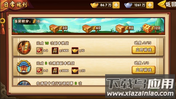 优先处理带有红点提示的任务,随后查看日常任务列表。完成日常可获得积分,积累积分开启宝箱,获取元宝与体力丹等必要资源。