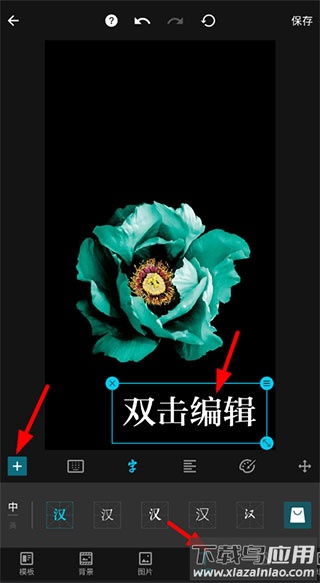 2、在编辑页面底部的菜单栏中找到并点击“文字”选项,通过左侧的“+”按钮添加一个文字输入框,双击框内即可输入水印文字内容。