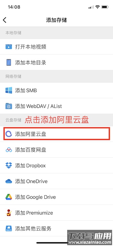 第二步:点击添加存储,进入存储管理页面,此处以阿里云盘为例演示;