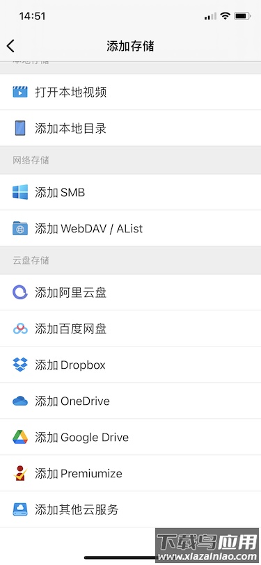 2.2 云盘:支持将阿里云盘、百度网盘、Dropbox、OneDrive、GoogleDrive、Premiumize等云存储中的影片导入应用进行管理与播放;
