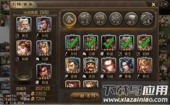 V7以下:马超、许褚、姜维、星彩、貂蝉(前期);许褚、张飞、姜维、貂蝉、太史慈或星彩(中期);许褚、赵云、董卓、太史慈、貂蝉或姜维(后期)。