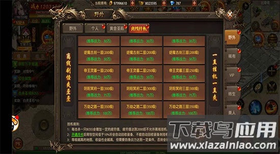 5、野外挂机:开服三天后开启离线挂机功能,下线前选择合适地图,休眠期间可自动积累经验、金币与元宝。