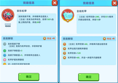 主动技能“变形机甲”:召唤机甲获得高额护盾,机甲的攻击有一定概率击退敌人,有效延缓感染者推进。