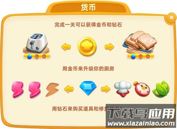 1、金币:通关关卡获得,连击与双倍道具可提高产出;用于升级设备与食材;建议在遇到困难关卡时再考虑升级,例如生产过慢则升级设备。