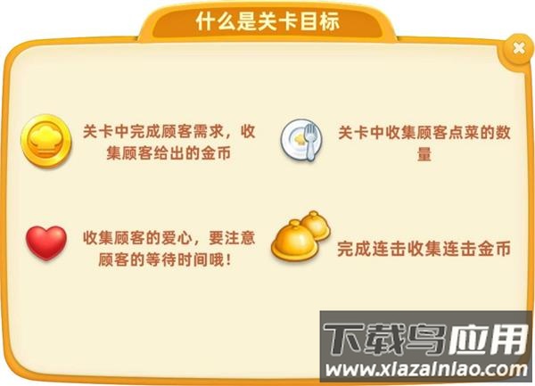 1、金币目标:通过完成顾客需求收集金币,达到指定营收金额;可使用连击或双倍道具加速完成,也可快速上菜提高需求完成量。