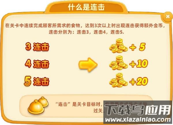 连击需连续完成顾客需求,连续上菜3次以上可触发并获取额外金币。最高为5连击,额外增加20金币。