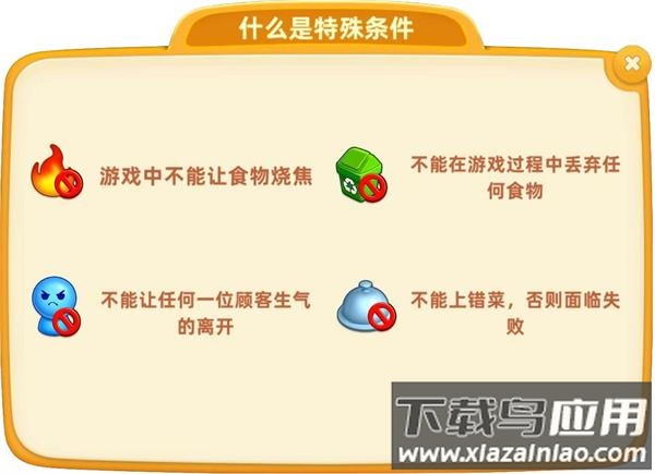 特殊条件指关卡限制,例如禁止烧焦或上错菜品,进入关卡时有明确提示。一旦触发即判失败,需格外留意。