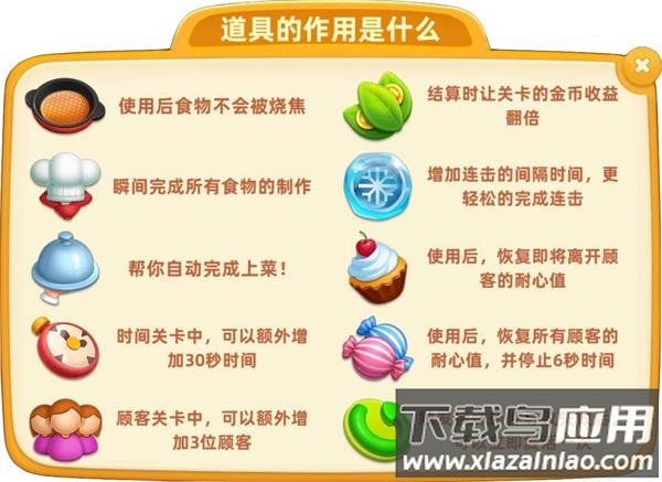 3、爱心目标:收集顾客爱心,需在顾客心情值低于爱心前完成全部需求;当顾客有多个需求时,可计划上菜以延长停留时间,心情值过低时上菜可部分恢复;注意最后一道菜上桌即判定需求完成,不再恢复心情;可使用小蛋糕或糖果道具自动恢复最低心情顾客的状态,小蛋糕定期免费领取,存储上限25个。