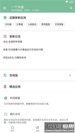 一个木函旧版本由上海花筏科技有限公司发布,是一款轻量且功能丰富的实用工具合集应用。这个2017年的经典版本与新版功能相近,但更为纯净,没有广告推送,也不会自动升级。软件体积仅4MB,轻巧简洁,界面清爽,无后台推送和唤醒,减少了不必要的信息干扰,帮助用户在繁杂的日常中保持专注。尽管体积小巧,它却集合了超过五十种实用工具,能够满足多种日常使用需求。