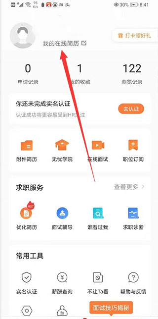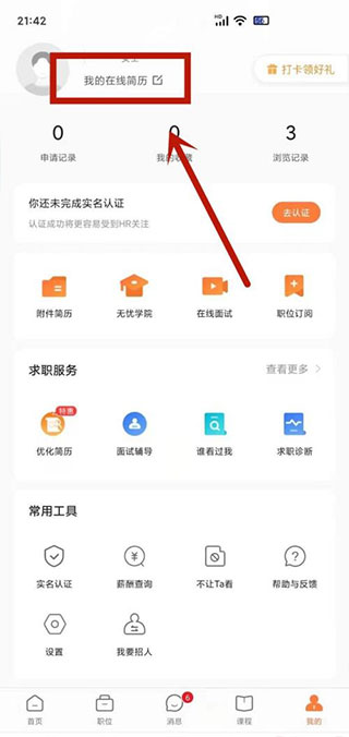 2、进入“我的在线简历”设置。
