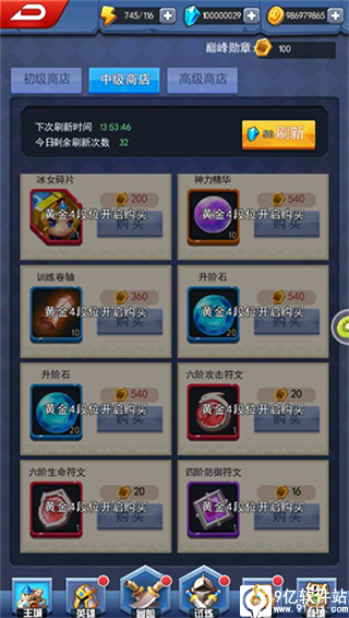 规则说明:玩家每日可领取日常奖励,赛季结束后根据所达成的最高段位领取赛季奖励。获得的巅峰勋章可在商店中兑换珍贵道具,包括金色英雄碎片等。