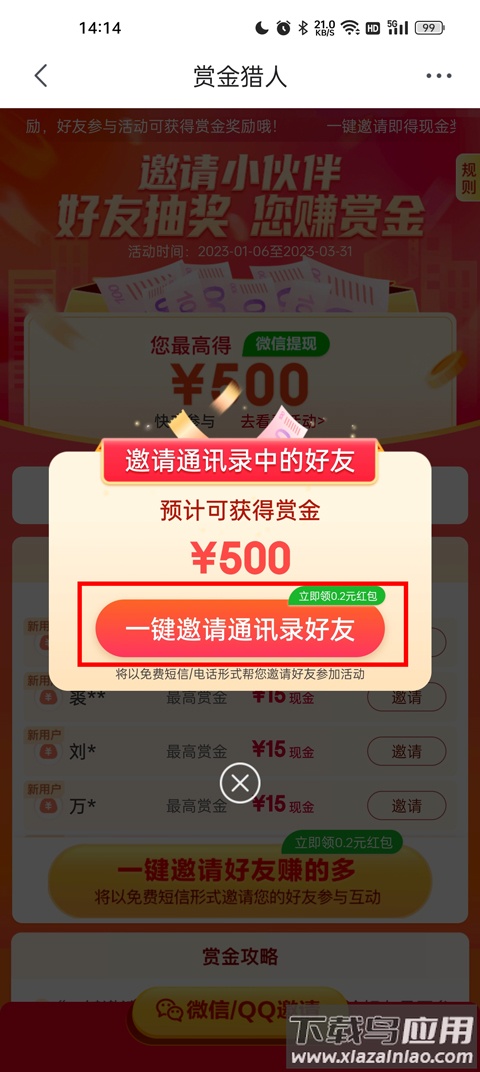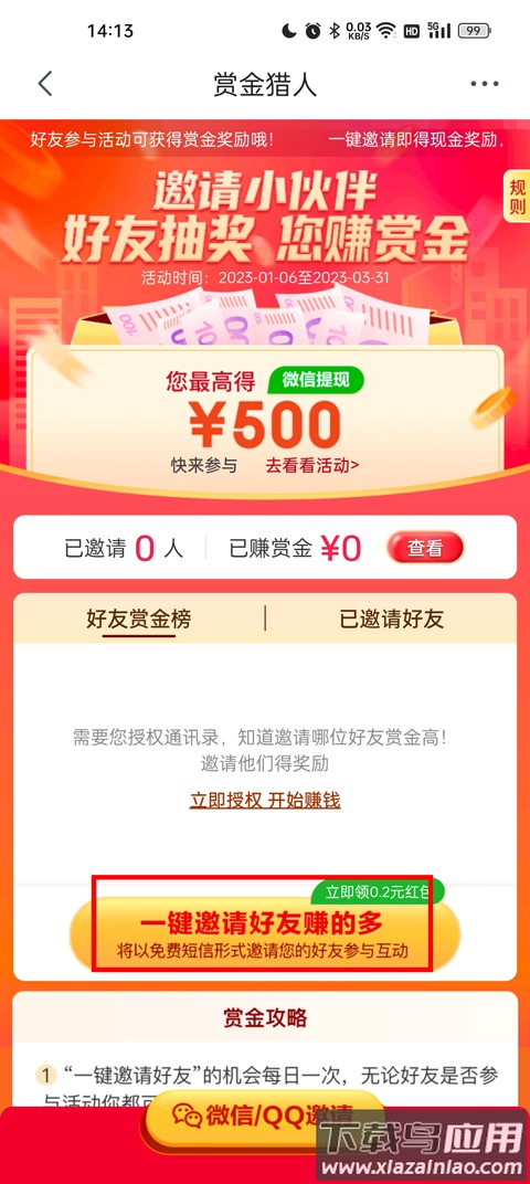 4、进入赏金猎人页面后,开启一键邀请权限,通过分享链接或页面邀请好友下载应用;每成功邀请一位新用户,即可获得相应的现金奖励。