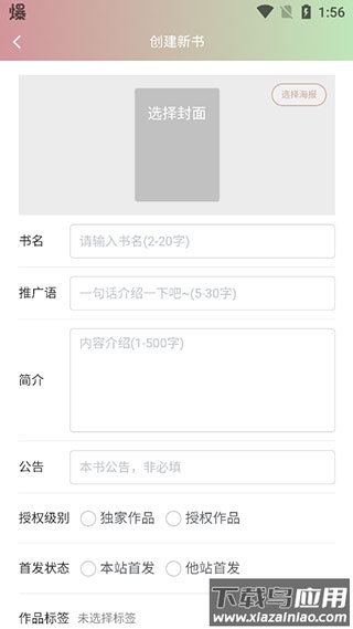 编辑作品的封面、书名、推广语和简介内容;设置作品状态与标签,接着按步骤提交文字内容,等待平台审核通过后即可发布。