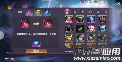 消耗20钻石;英雄等级恢复为1级,并返还所有升级与升阶资源。