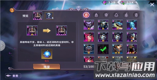 消耗降星石或钻石;英雄等级保持不变,星级降低一级,并返还所消耗的全部材料;非主力英雄的材料返还将转换为随机英雄碎片。