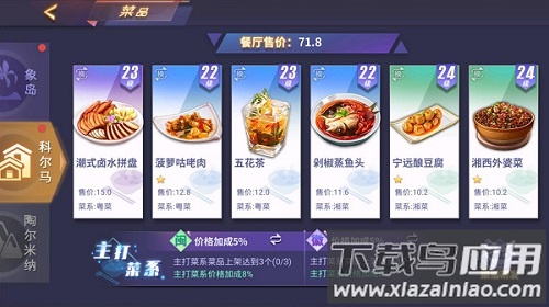 如今各地中餐厅的菜单都留有八大菜系的印记,例如湘菜馆的辣椒炒肉、川菜馆的麻婆豆腐、粤菜馆的烧鹅……在这款模拟经营游戏里,厨房自然也准备了八大菜系的丰富菜品。玩家可以使用美食券或厨神券研发新菜式,并将获得的菜品配置到对应餐厅。每家餐厅可设定一个主打菜系,从而获得一定的价格加成;主打菜系也能根据菜品储备情况进行调整。