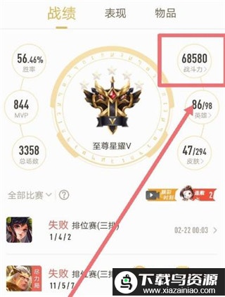 3、页面跳转至战绩详情,在右侧可以看到当前战斗力数值。