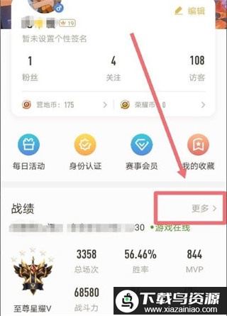 2、随后进入个人主页,在战绩栏目后方,点击更多按钮。