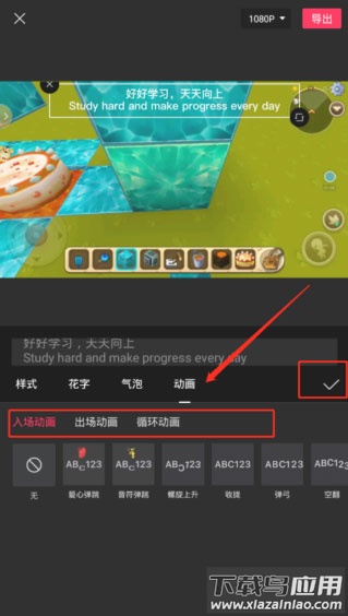 8. 在文字编辑页点击“动画”功能,为字幕选择入场和出场效果;设置完成后,点击右侧的确认对勾图标。