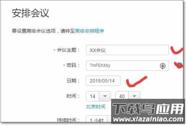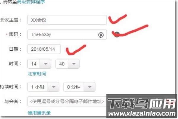 5. 填写会议详细信息,包括会议主题、访问密码、日期时间与预计时长,并添加参会者的电子邮件地址。