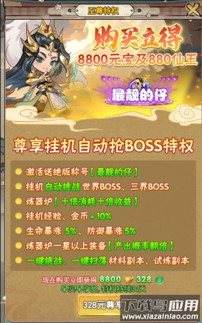 4、至尊特权在0.1折版本中性价比突出,附赠绝版称号,并能加速升级、提升属性、增加爆率、解锁一键挑战等功能;