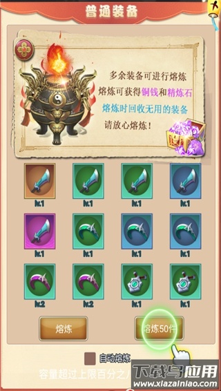 多余装备可进行熔炼处理,熔炼后能获得铜钱与精炼石;系统还设有自动熔炼功能,当背包容量超过80%上限时会自动启动,此功能可手动开关。