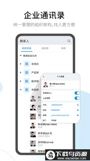 3. 内置企业组织架构,将通讯录装入手机,便于快速查找联系人;