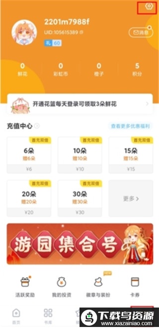 1、进入“我的”页面,点击右上角的设置图标;