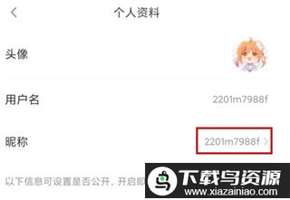3、跳转至个人资料页后,点击昵称栏目;