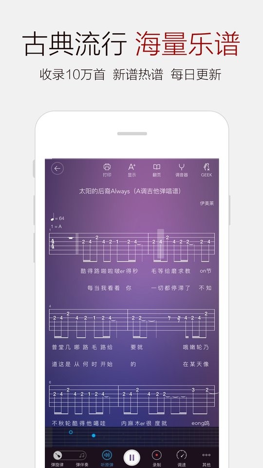 应用依托弹吧音乐网的乐谱资源,建立了包含超过十万首钢琴谱与吉他谱的曲库,满足各类弹奏需求。