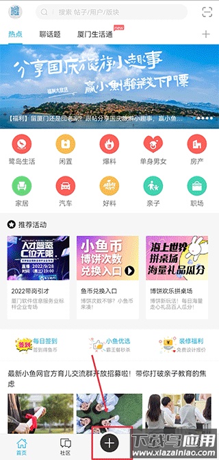 1、启动厦门小鱼网app官方版,在界面底部找到并点击“+”号图标。