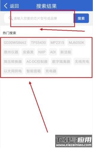 2、输入需要查询的芯片型号,也可直接选择热门搜索词进行查找。