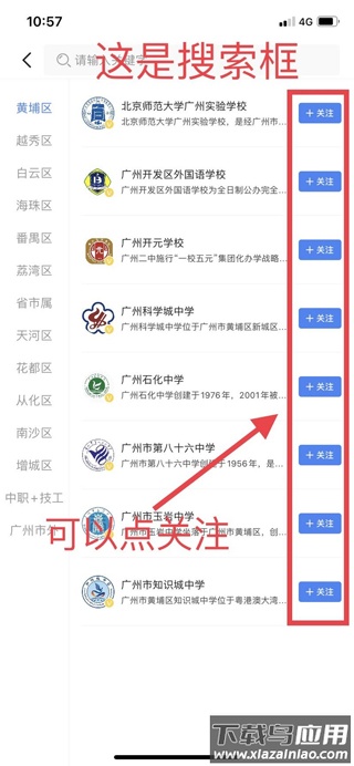 3、在咨询页面,可按学校所属类别查找,或在搜索框输入学校名称;点击对应学校右侧的“+关注”,即可进入该校主页。