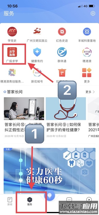 1、打开app,点击首页下方“服务”板块中的“广报求学”,再点击“中考咨询”,即可进入咨询页面。