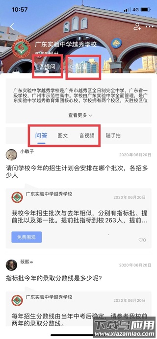 4、在学校页面,点击上方“提问”或“私信”即可进行在线咨询;同时可通过图文、音视频等栏目了解学校详情。