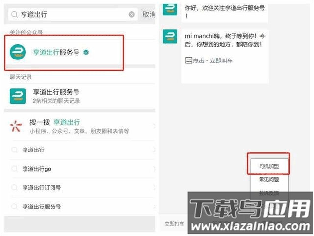 2、点击服务号右下角“享道客服”,选择“司机加盟”入口,查看加盟条件后,点击页面下方“加入享道”;