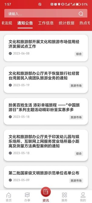 此移动端是全国文化和旅游市场政务服务的统一入口,核心目标是推动政务服务向“掌上办”“指尖办”转型。它集成了政策资讯发布、行政审批在线办理、培训学习资源、电子证照管理等多种服务;用户可通过该平台办理营业性演出及跨地区巡演等业务,并实时查询通知公告、相关政策法规以及个人办事进度。