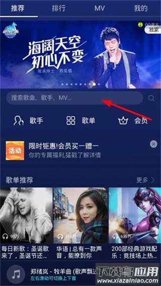 3、搜索栏下方设有听歌识曲入口,帮助用户迅速识别环境中正在播放的歌曲。