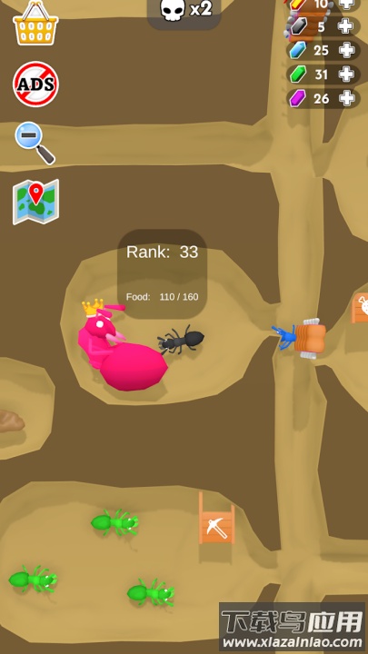 1、动手挖掘四通八达的地下隧道,构建复杂的地下网络,为蚁群开拓全新的生存空间。不断搜集食物来喂养蚂蚁,促进种群增长,每一份收获都让王国向强盛迈进一步。