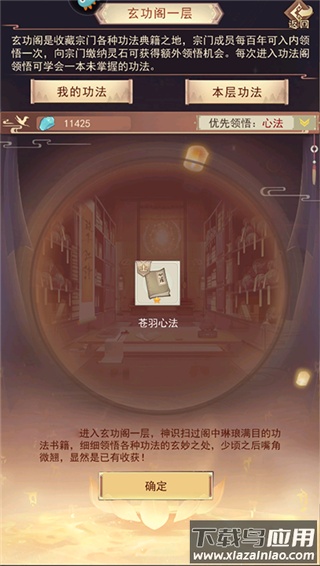 藏经阁玄功阁收藏有门派各类功法,职务等级决定可进入的层数及所学功法星级。玩家可设定优先领悟的功法类型,但仍有几率领悟到其他种类。