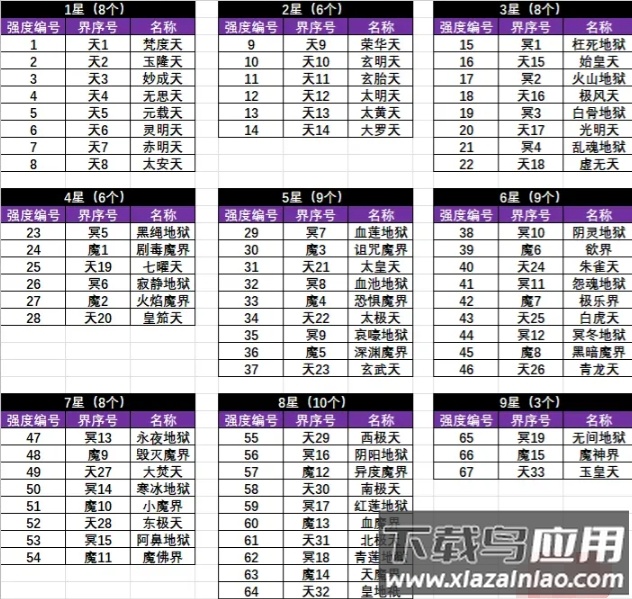 在过往常见的设定中,仙、冥、魔三界往往各自独立、并行发展,属性提升后可同时推进三界进度。而本作将三界共六十七张地图串联为一条循序渐进的挑战路线;属性提升后通常只能推进其中一界的单一地图,无法同时突破其他界域。下图依据实测与灵地等级推测,整理了从一星至九星天的地图强度顺序,整体具备较高参考价值。